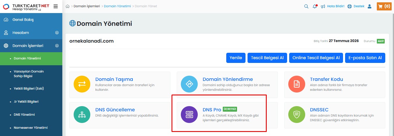 DNS kayıtları, alan adınıza bağlı hizmetlerin doğru ve kesintisiz şekilde çalışmasını sağlar. Turkticaret.Net tarafından tescil edilmiş ve nameserver adresleri Turkticaret.Net üzerinden yanıt alan tüm alan adlarınız için DNS Pro sekmesi üzerinden kayıt oluşturabilir, güncelleyebilir ya da silebilirsiniz.