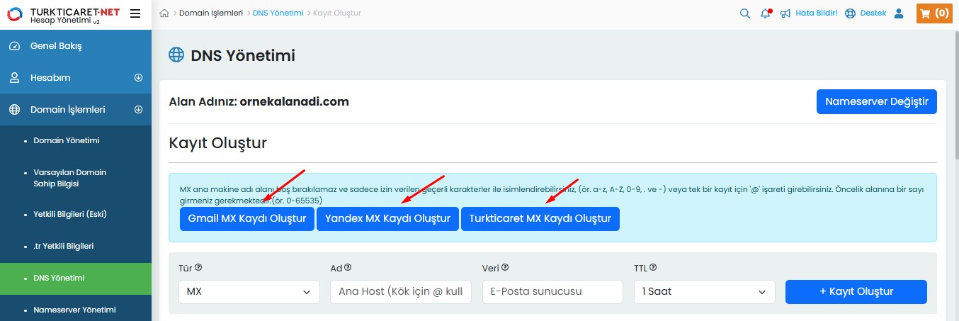- “Yandex MX Kaydı Oluştur” ve “Gmail MX Kaydı Oluştur” butonları ile mail kayıtları oluşturabilirsiniz.