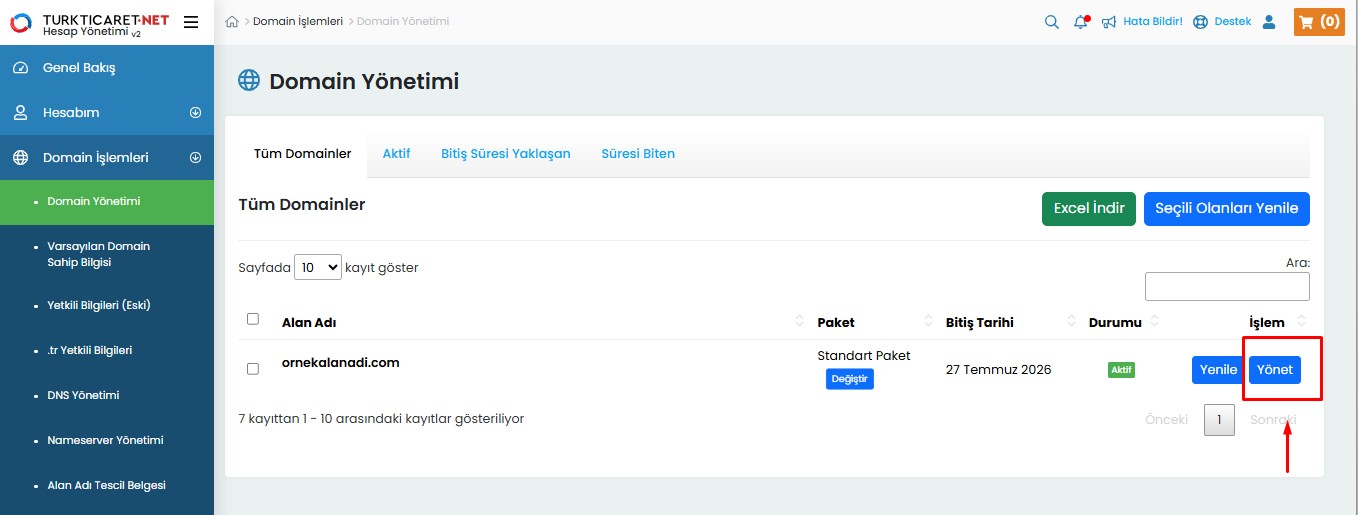 - “Domain İşlemleri” > “Domain Yönetimi” bölümünde, Alan Adınızın yanında bulunan “Yönet” butonuna tıklayın.