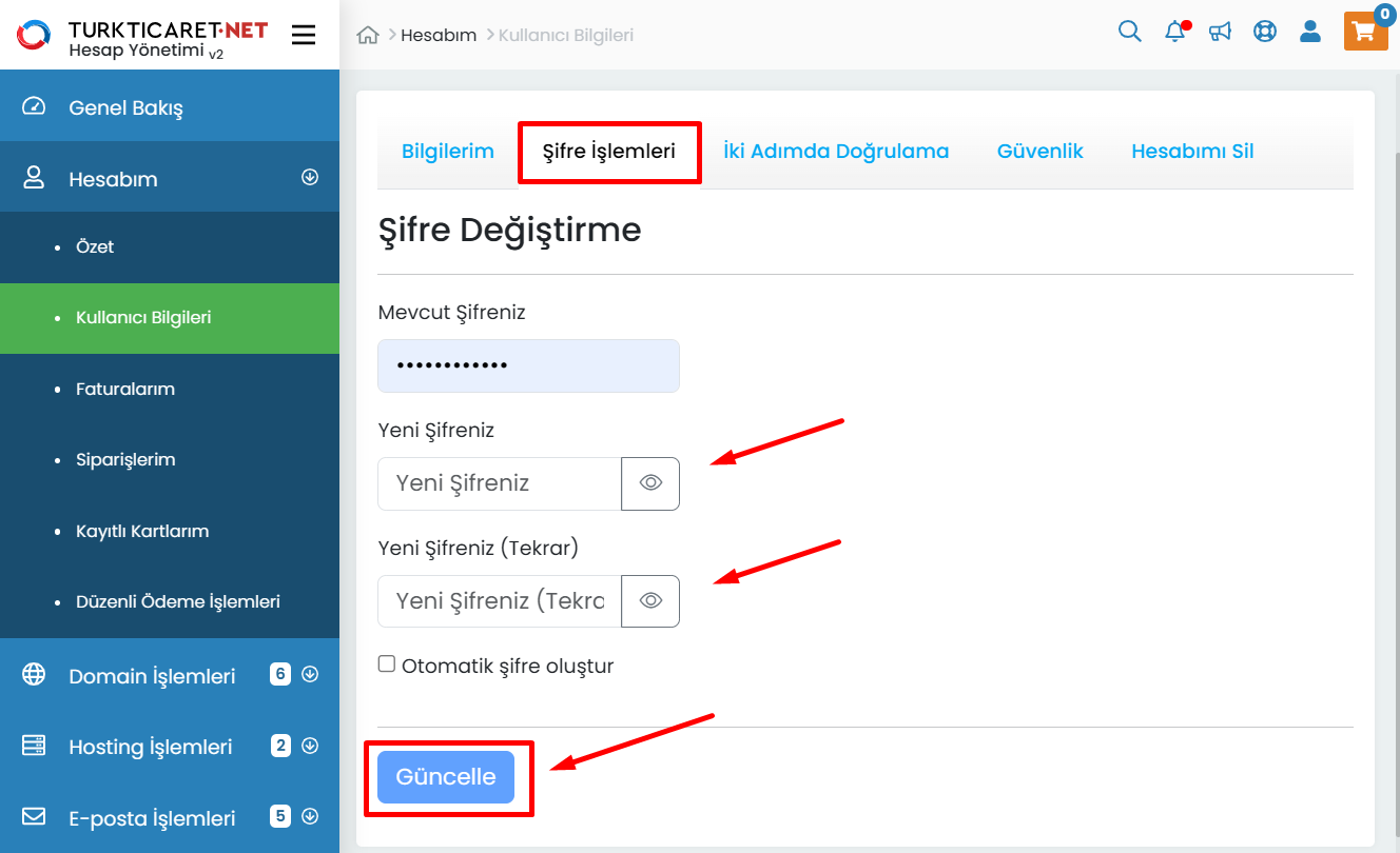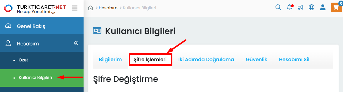 Turkticaret.Net hesabınıza kayıtlı şifre bilgilerinizi değiştirmek için;